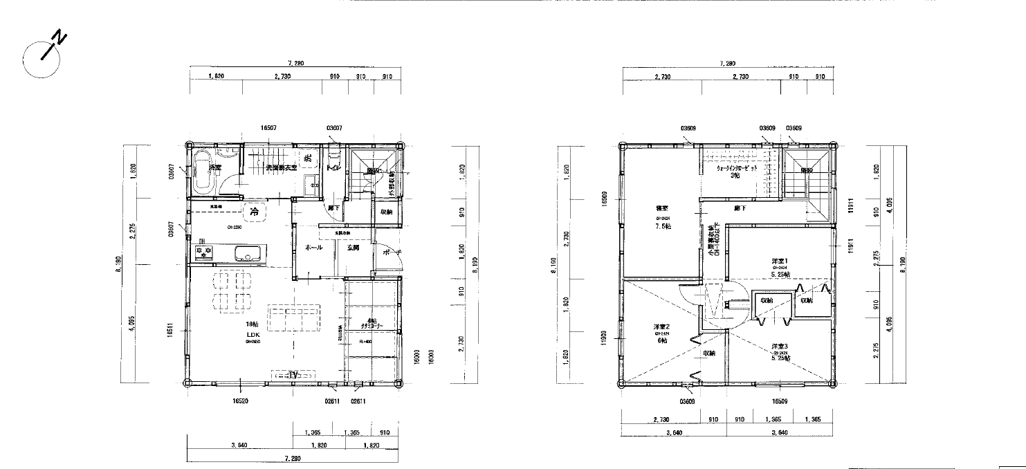 2階 寝室7.5 洋6 洋5.25 洋5.25 1階 和4(畳コーナー) 居間18 風呂 水洗 駐車5台可
