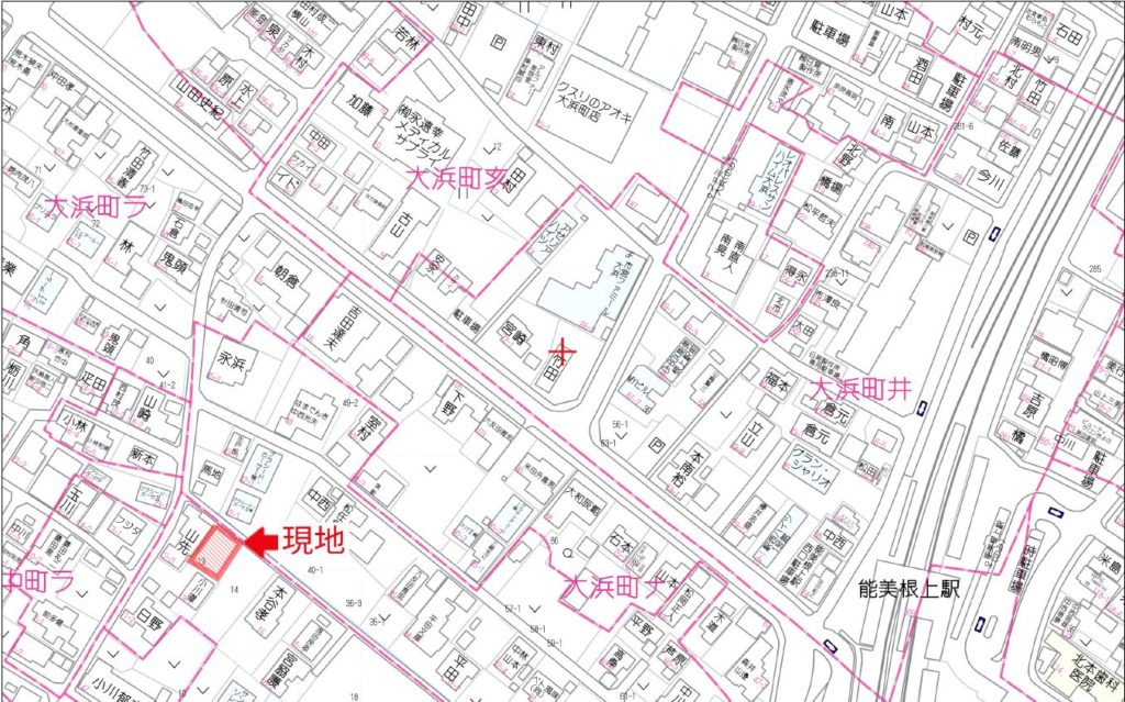 ※ 北北西向き ※ 住宅・資材置き場可 ※ アオキ大浜町店・・・(約)440M 農地転用許可申請必要 ※ショッピングプラザ・マルエ-根上店・・・(約) 1,400m ※ セットバック必要。